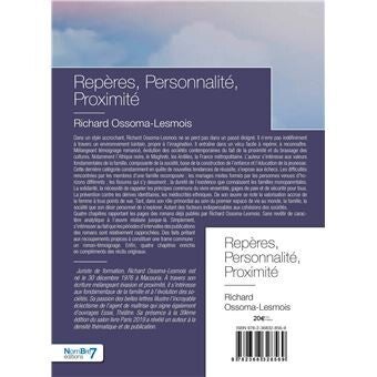 Quatre chapitres rapportant les pages des romans déjà publiés par Richard Ossoma-Lesmois, sans revêtir de caractère analytique à l'oeuvre réalisée jusque-là. Ce roman, Repères, Personnalité, proximité (éditions Nombre7), restaure la base de la construction pour l'enfance, l'éducation pour la jeunesse et le jeu de la solidarité pour les familles monoparentales.