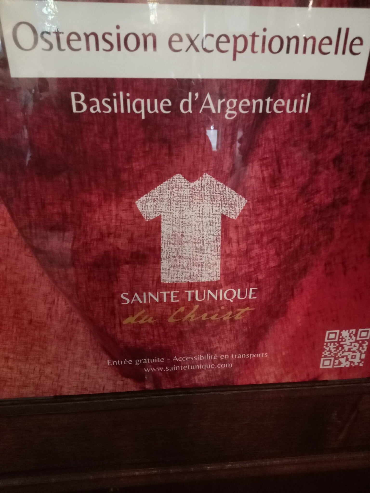 La Sainte Tunique d’Argenteuil est le vêtement porté par le Christ de la Sainte Cène au pied de la Croix. C’est le témoin charnel de la Passion : la pièce de laine est tachée du sang du Christ. A l'entrée de la scène d'exposition, un visuel indiquant le sens de la visite porte l'inscription : " La sainte tunique du christ, sauve-moi. "